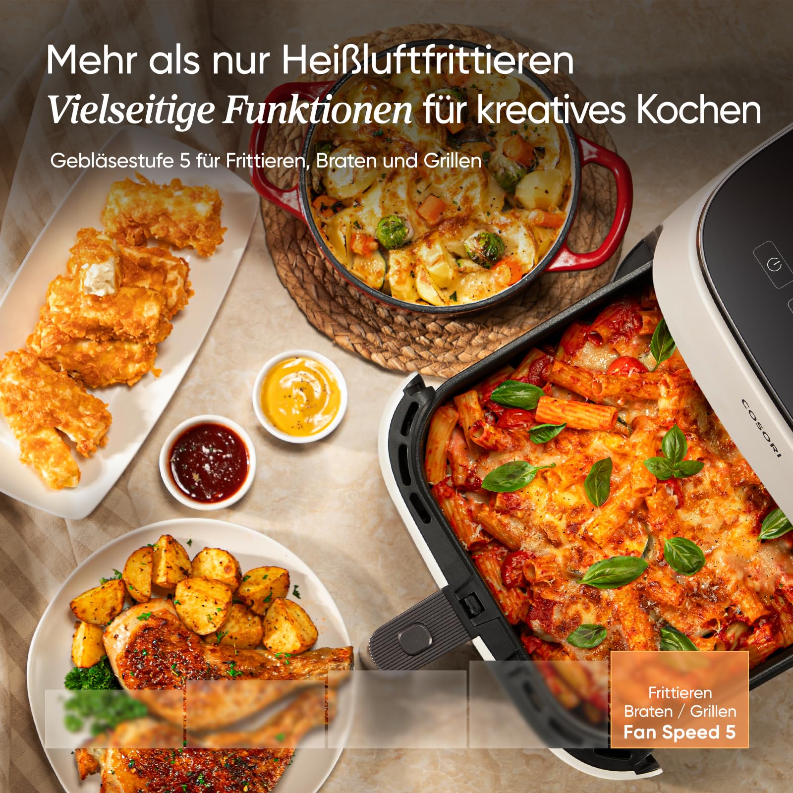 Vielseitiges Kochen: Die Funktionen zum Braten, Frittieren und Grillen auf Lüfterstufe 5 eignen sich für jedes Gericht – vom Frühstück bis zum Abendessen.
