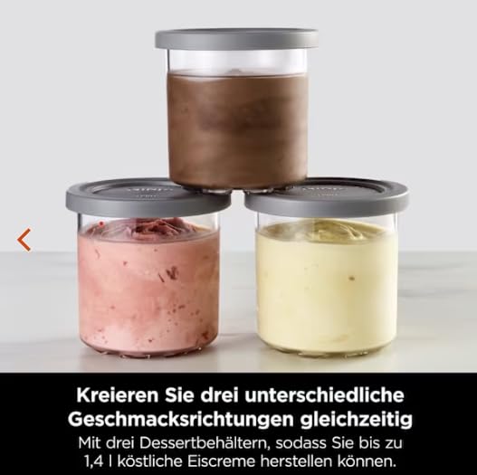 3 DESSERTBEHÄLTER: Stellen Sie bis zu 1,4 Liter Eis her und bereiten Sie 3 verschiedene Geschmacksrichtungen gleichzeitig zu, um für jeden Geschmack etwas dabei zu haben. Spülmaschinenfeste Behälter und abnehmbare Teile für eine einfache Reinigung.