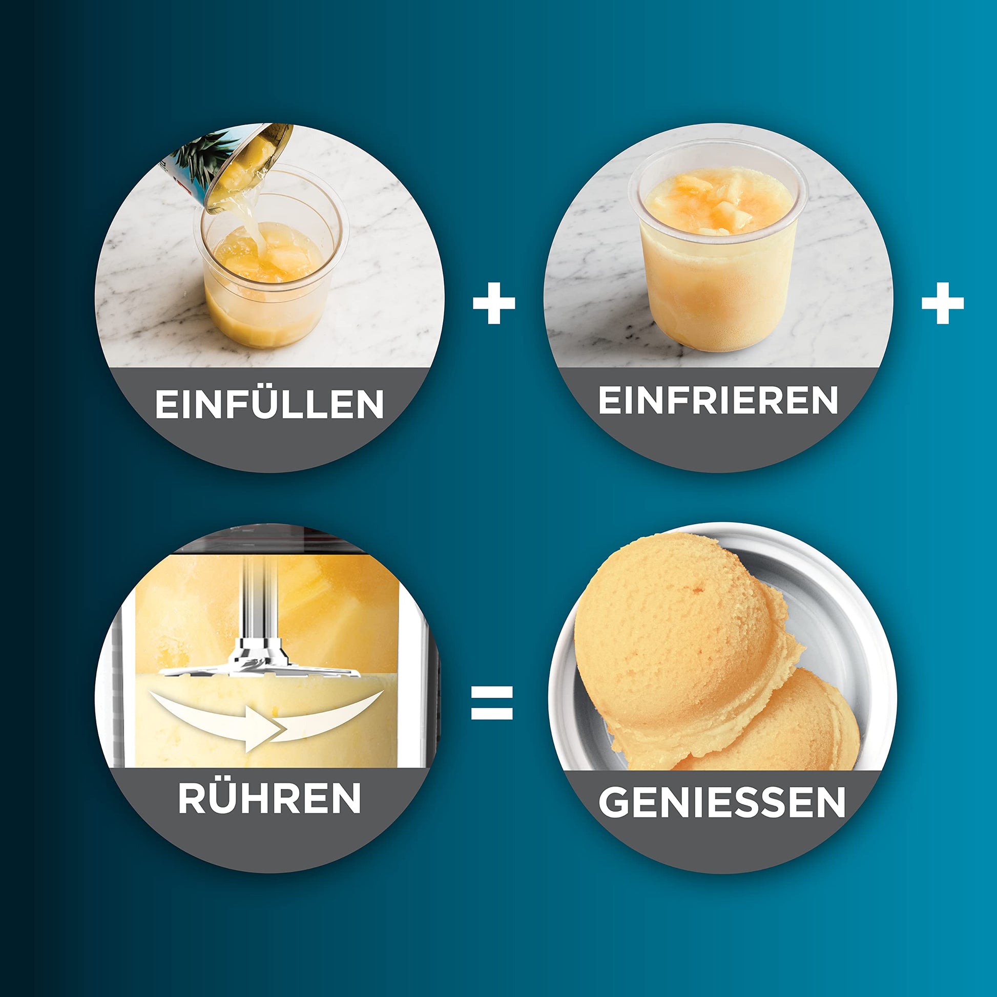 FÜLLEN, EINFRIEREN, GENIESSEN Füllen Sie einfach einen Behälter mit Zutaten, frieren Sie ihn 24 Stunden lang ein und verarbeiten Sie ihn dann in wenigen Minuten, wenn Sie bereit sind, Ihre gefrorene Basis in eine cremige Leckerei zu verwandeln.