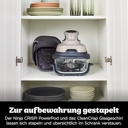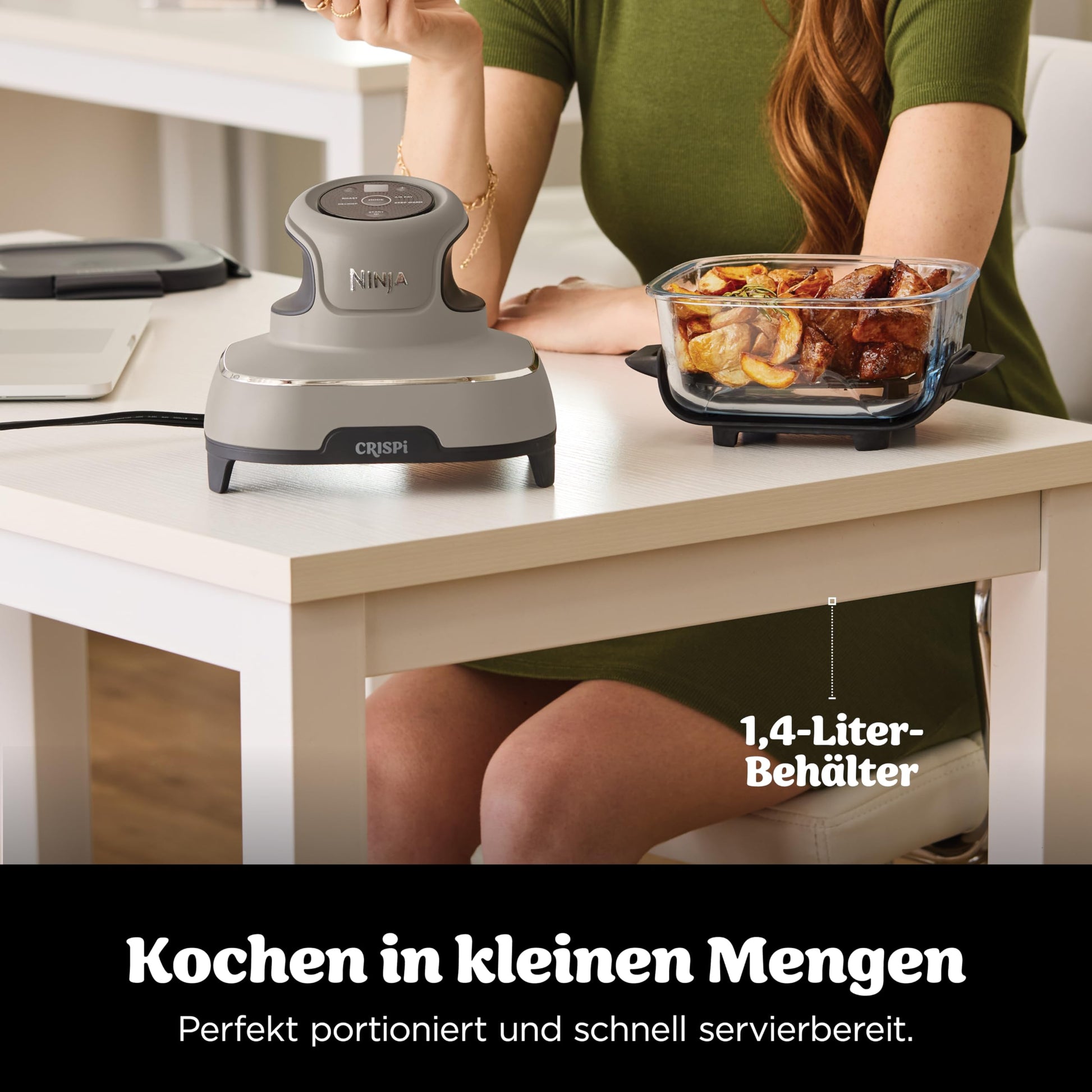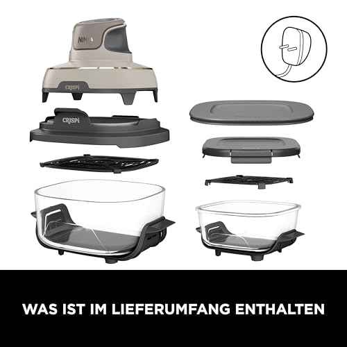 ENTHÄLT: 1700-W-Power-Pod (EU-Stecker), 2 spülmaschinenfeste Glasbehälter (1,4 l und 3,8 l), 2 antihaftbeschichtete Crisp-Bleche, 2 Aufbewahrungsdeckel. H: 34,5 cm B: 30,4 cm T: 34,0 cm. Farbe: Grau