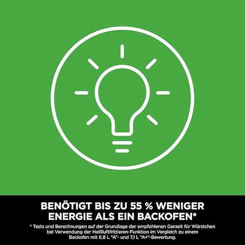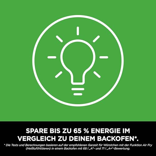 Bis zu 45 % weniger Energieverbrauch als ein Backofen*: (*Tests und Berechnungen basieren auf der empfohlenen Garzeit für Würstchen unter Verwendung der Heißluftfunktion im Vergleich zu herkömmlichen Backöfen.)