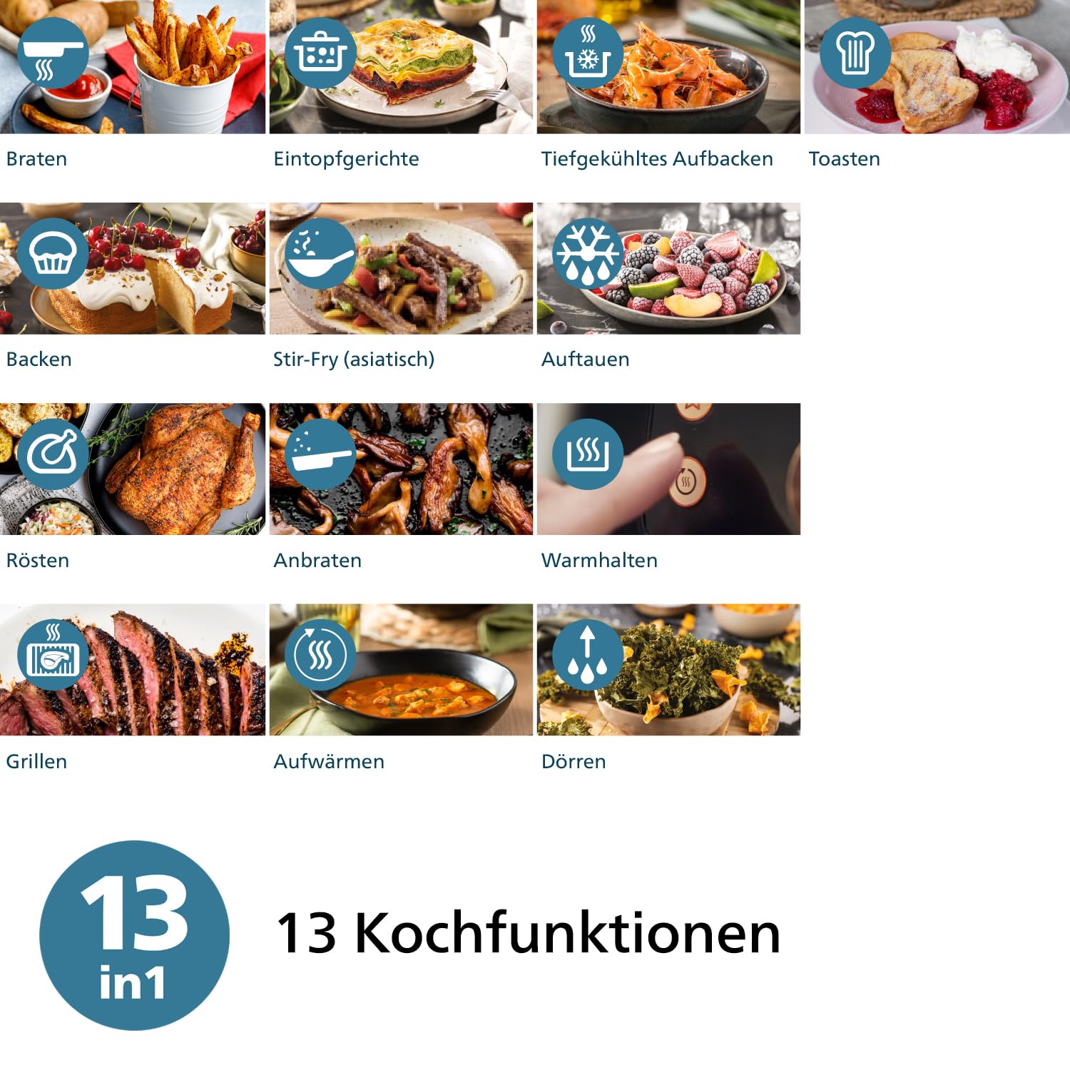 - 13 ZUBEREITUNGSMETHODEN – Braten, Rösten, Grillen, Backen, Pfannenrühren und Schmoren, Sautieren, Toasten, Zubereitung von Tiefkühlprodukten, Auftauen, Trocknen, Aufwärmen und Warmhalten.