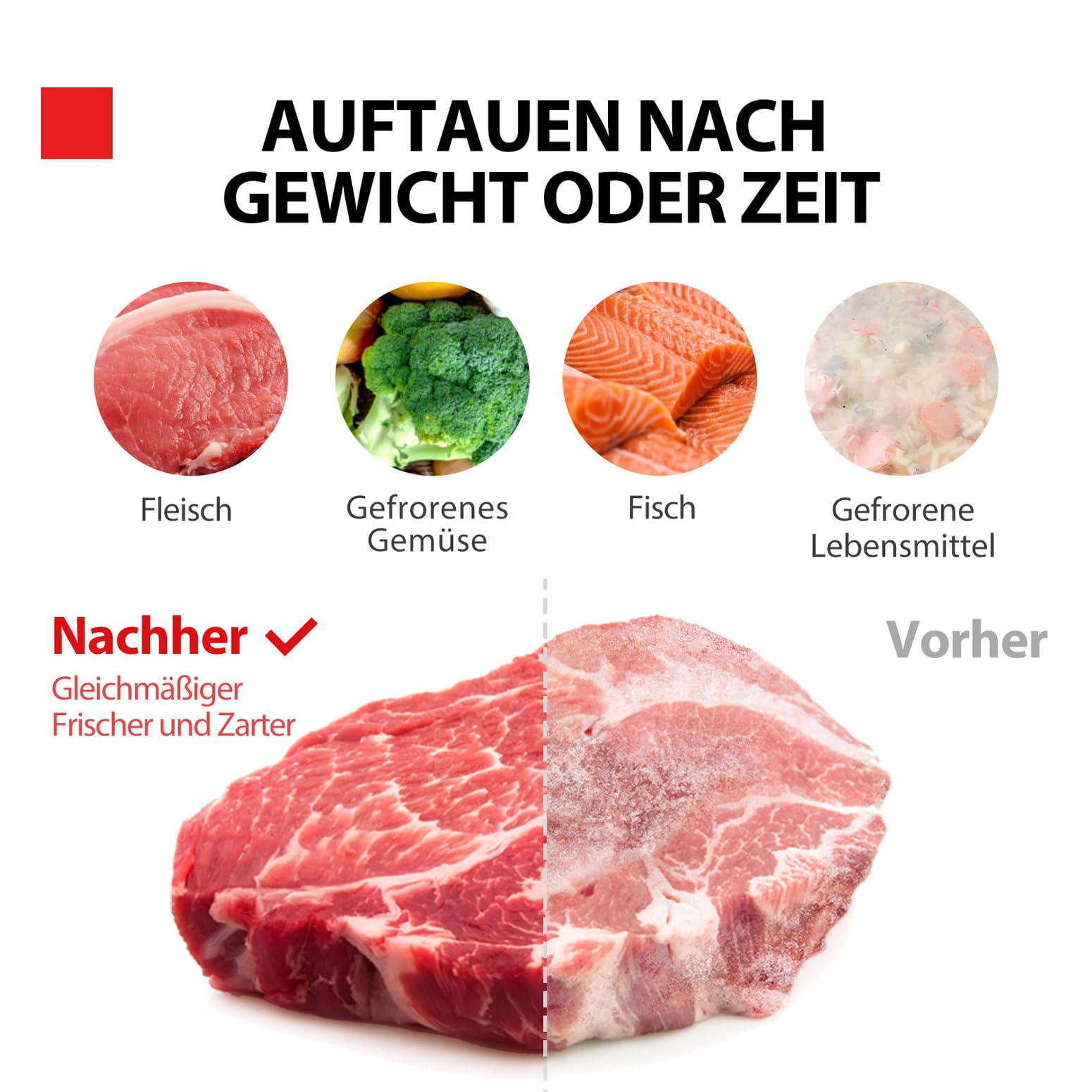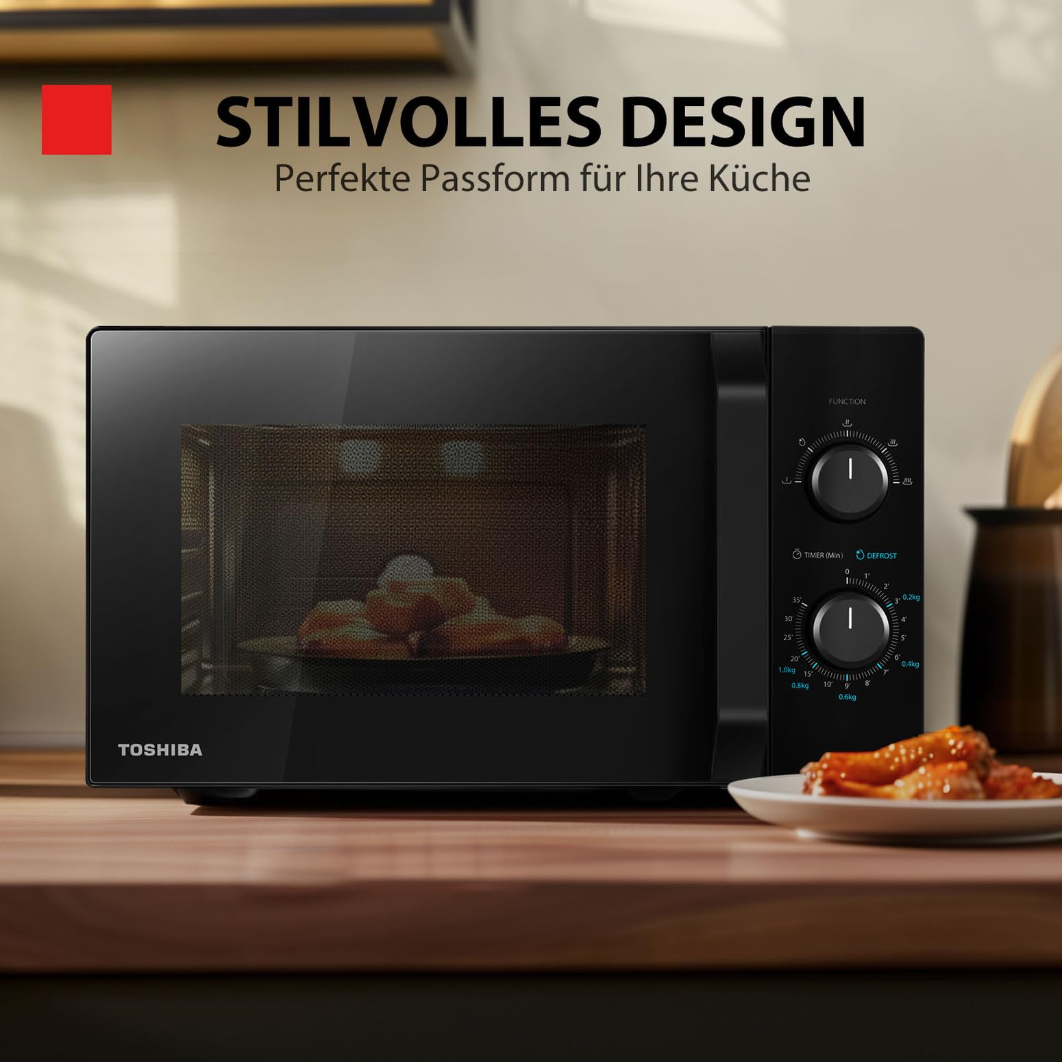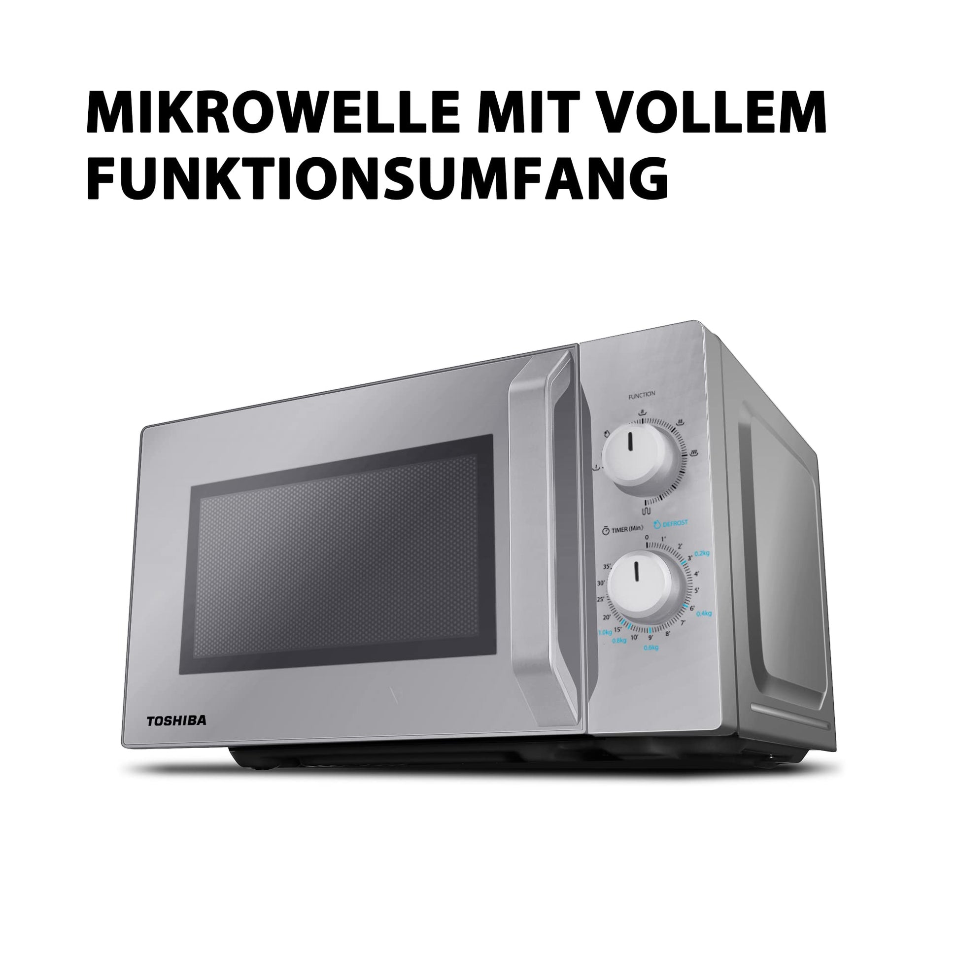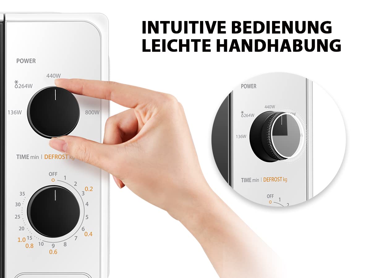 Praktische Funktionen: Auftauen nach Gewicht/Zeit, 35-Minuten-Küchenuhr, rutschfeste Füße, stabiler Drehteller.