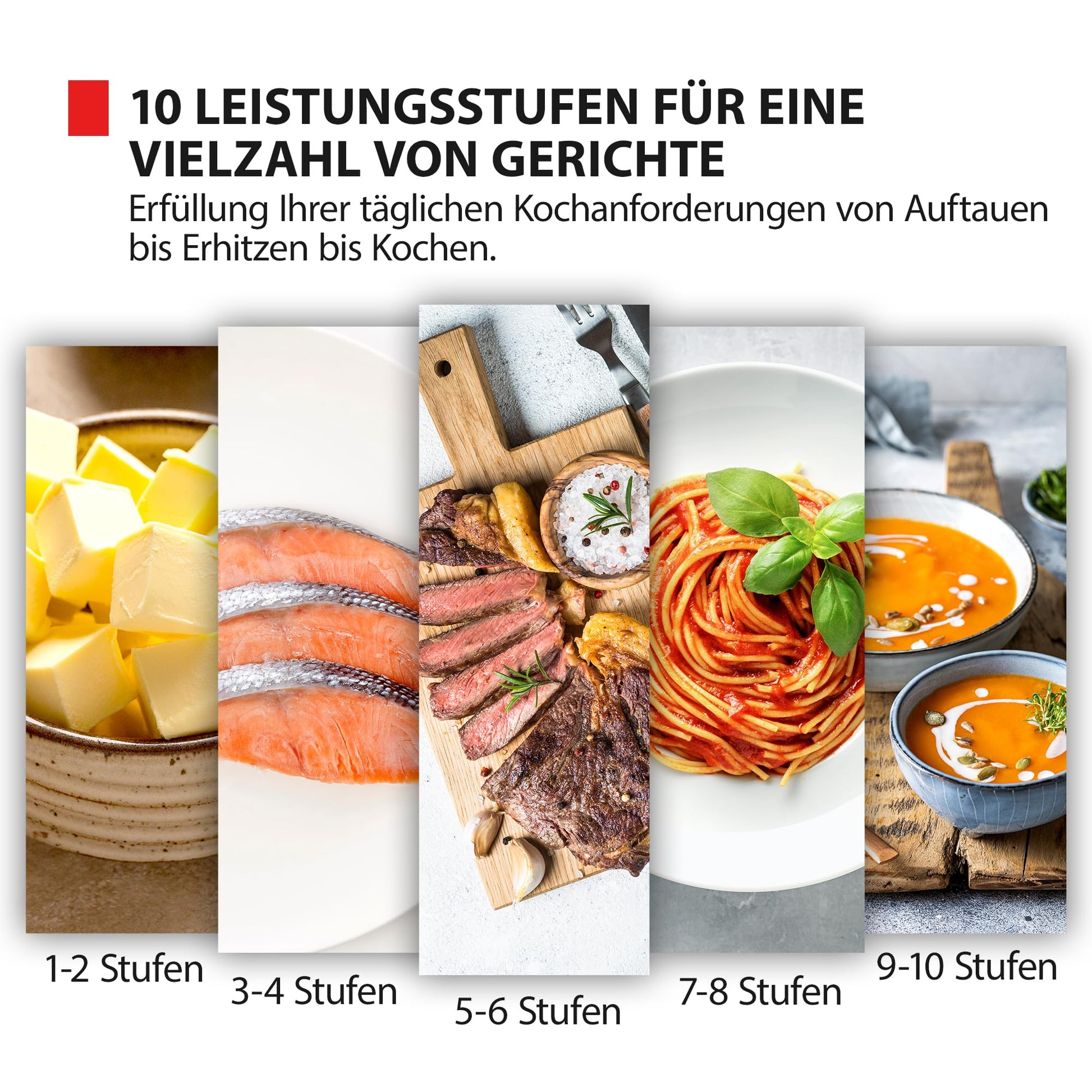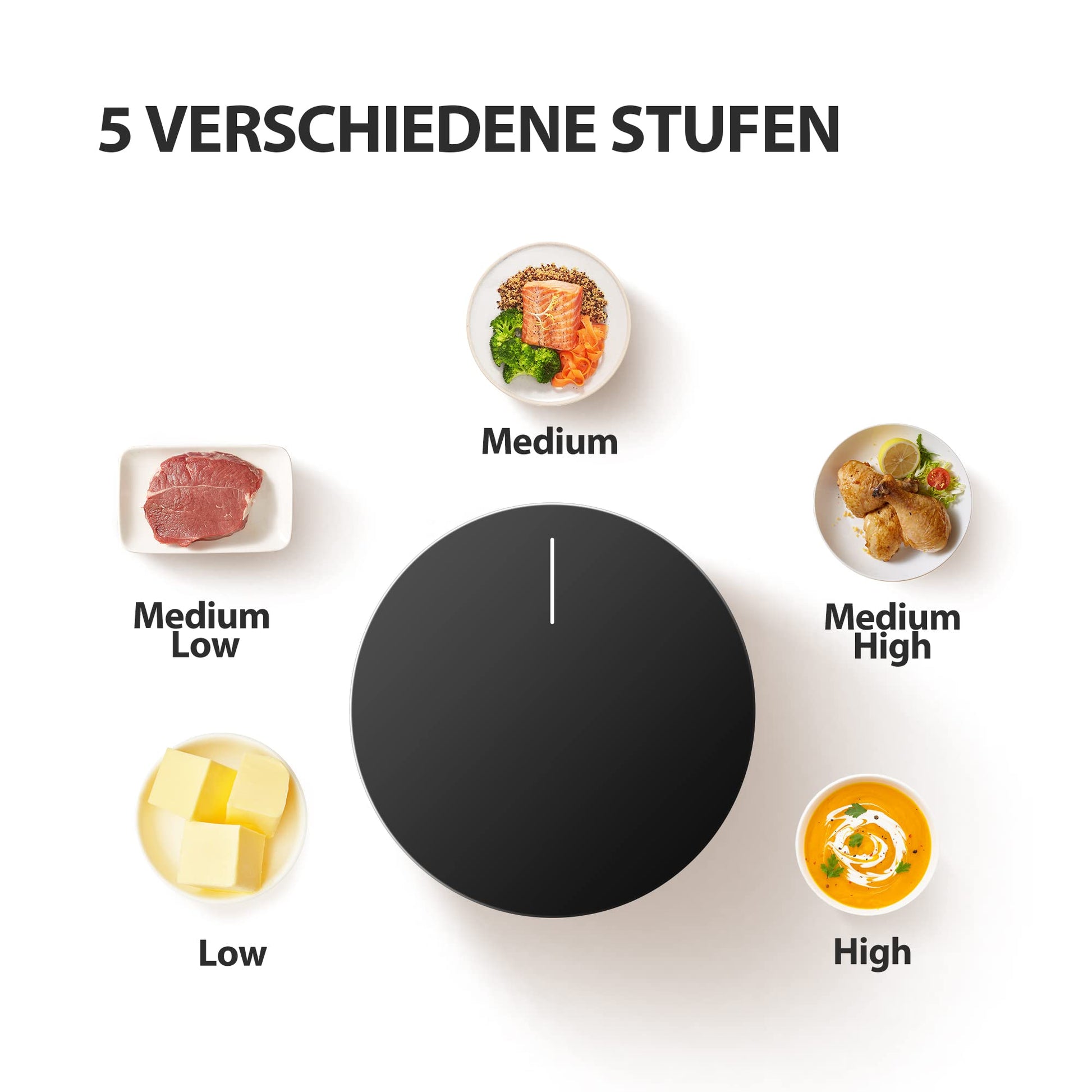 5 Leistungsstufen: für mehr Flexibilität in der Küche – vom Warmhalten von Speisen bis zum Erhitzen von Flüssigkeiten.